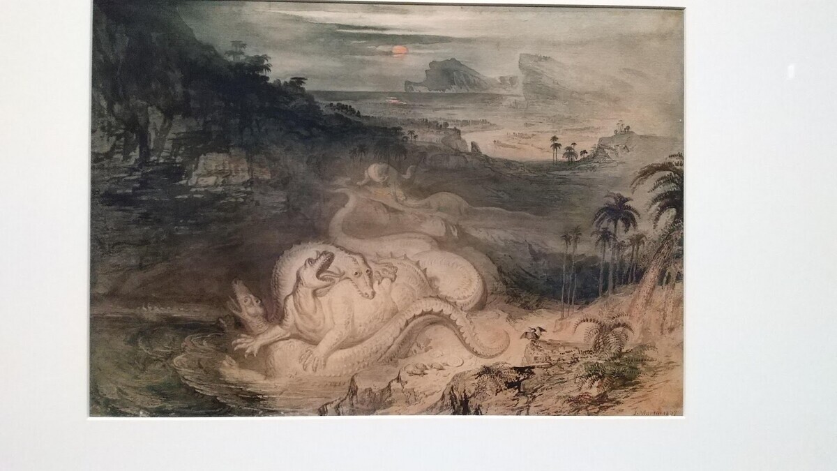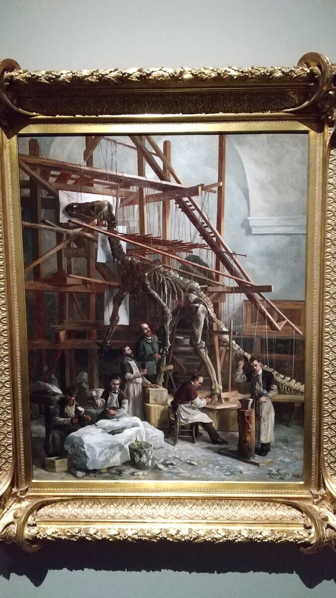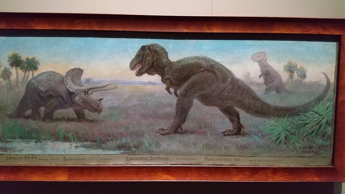 ナイトの絵画はさまざまなところでよく紹介されていて有名だ.私的にはグールドが絶賛していたアメリカ自然史博物館所蔵の「ドリプトサウルス」,そしてティラノサウルスに対して低く構えるトリケラトプスというおなじみの構図の原点ともいえる「白亜紀:モンタナ」を観賞できたのが格別だった.