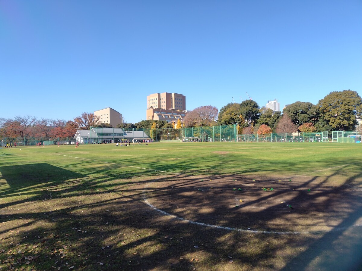 日本女子大と目白通りをはさんで向かう合う目白台運動公園.奥に日本女子大が見える.